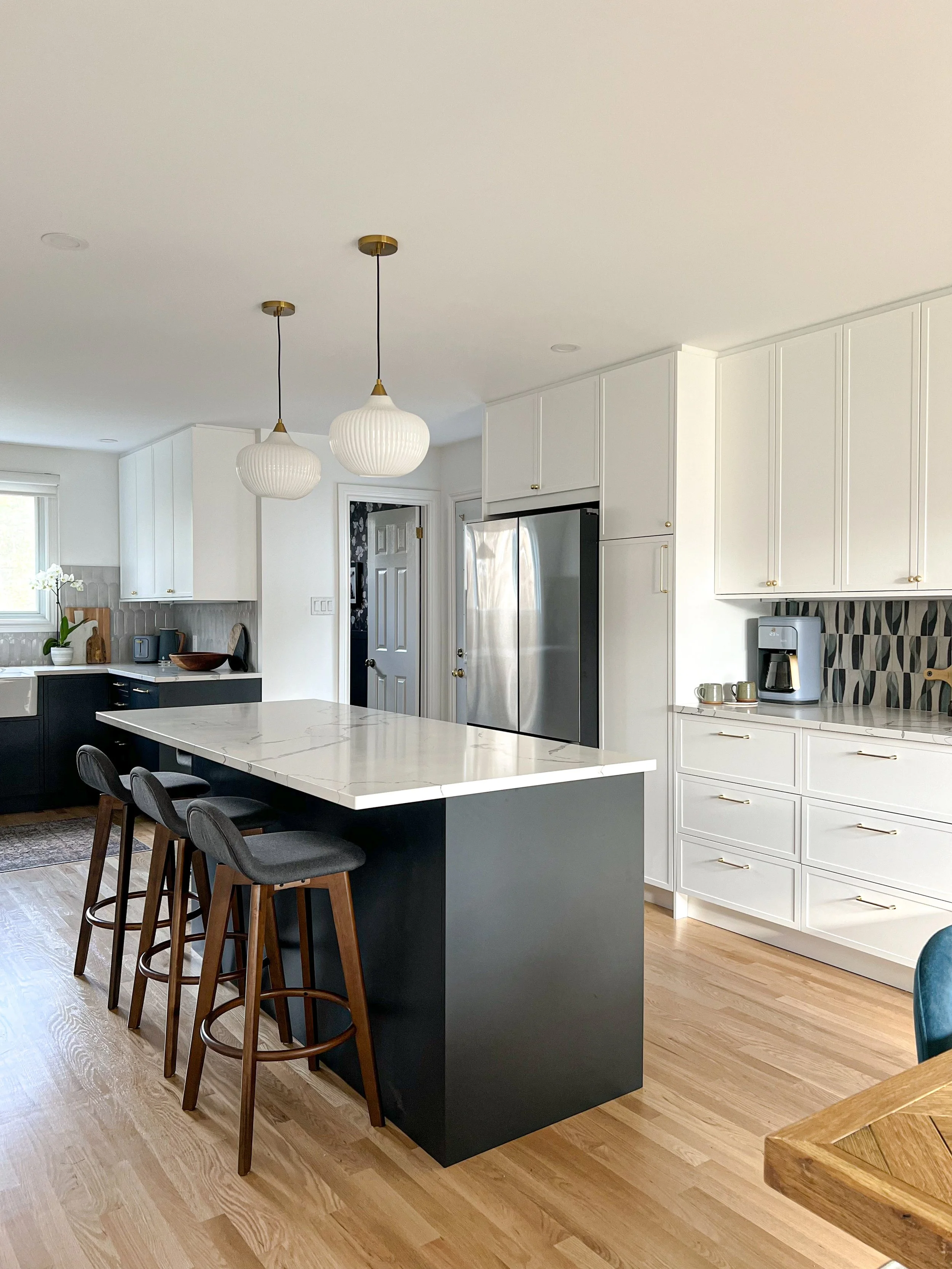 Kitchens are the central hub for daily life, referred often as the ‘heart of the home’. Functionality is a key to making this room equipped and organized in such a way that it can easily and efficiently handle cooking, to hosting gatherings. This kitchen-dining room renovation combines navy cabinets, white cabinetry, brass features, and warm wood flooring and is not just a style upgrade—it's a transformation that brings functionality, warmth, and timeless appeal for this family of 4.